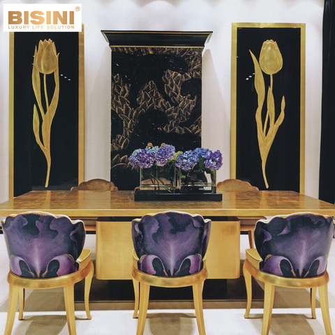 クラシックゴールドリーフ木製長方形ダイニングテーブル8人用ダイニングチェア付きアートルーム装飾ゴールデンダイニングセット