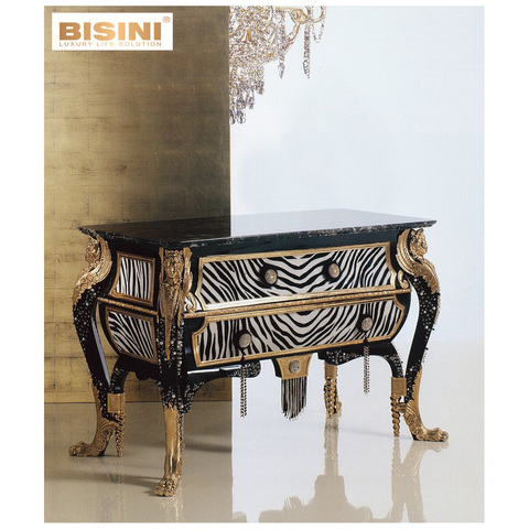イタリアの木製2引き出しリビングルームコンソールテーブル人工ゼブラレザーと黒大理石トップ真鍮装飾キャビネット