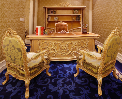 เฟอร์นิเจอร์สำนักงานบ้านสไตล์อิตาลีหรูหรา,โต๊ะผู้บริหารแกะสลักไม้และทอง24K พร้อมเก้าอี้โต๊ะเขียนหนังสือวีเนียร์ไม้แฟนซี